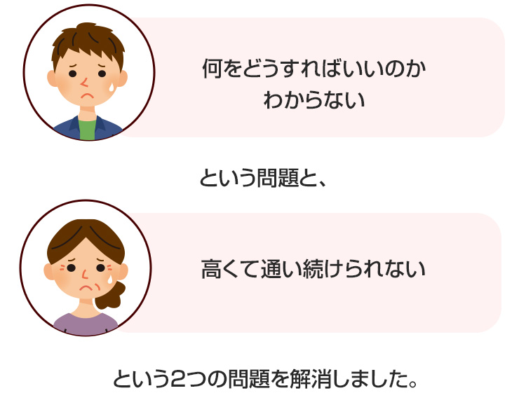 このセミパーソナルトレーニング指導により、一般のジムで起こりがちな