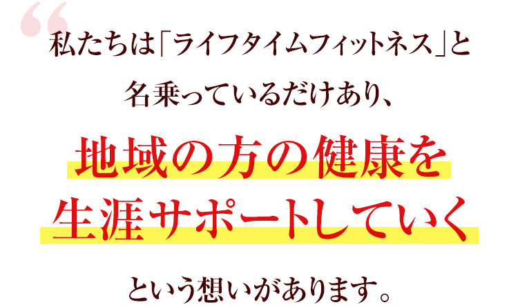 ライフタイムフィットネスの「健康寿命を10歳伸ばす」という理念に多くの方に共感いただき、身体の健康面をサポートさせていただくだけでなく、街のホットステーションとして、たくさんの方に愛されてきました。