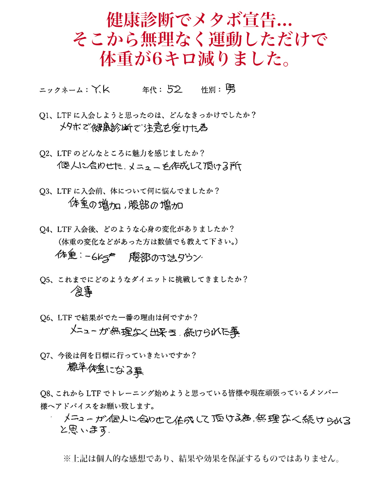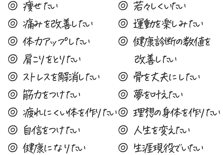 ですから、ダイエット目的の方はもちろん、筋力アップ、痛み改善、機能改善、リハビリから、生活習慣病の診断を下された方も、ぜひ一度相談してください。