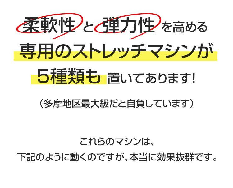 ダイエットでも、筋力アップでも、痛み改善でも、どんなニーズの方も、必ずストレッチメニューが入っています。その土台の上に、各自の目的に沿ったメニューを行います。だから、無理なく、結果がでるのです。