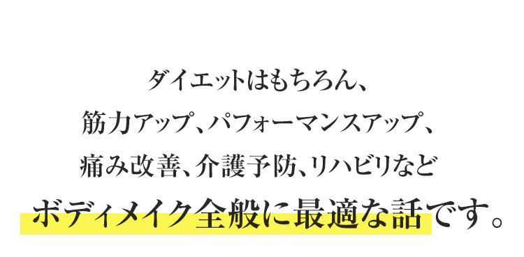 筋力アップはもちろん、腰痛や膝痛など、体の不調の改善も、食事を変えるだけでは、限界があります。