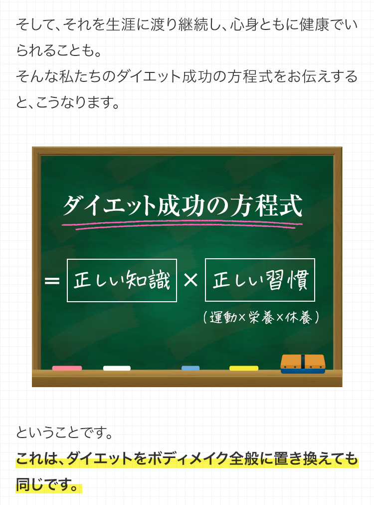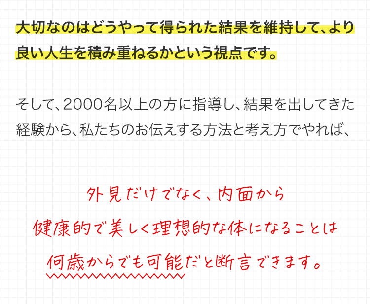 なぜなら、私たちは大人にとって最も最適な方法で、心身ともに健康で、理想的なカラダになり、それを生涯にわたり維持できるアプローチを行なっているからです。