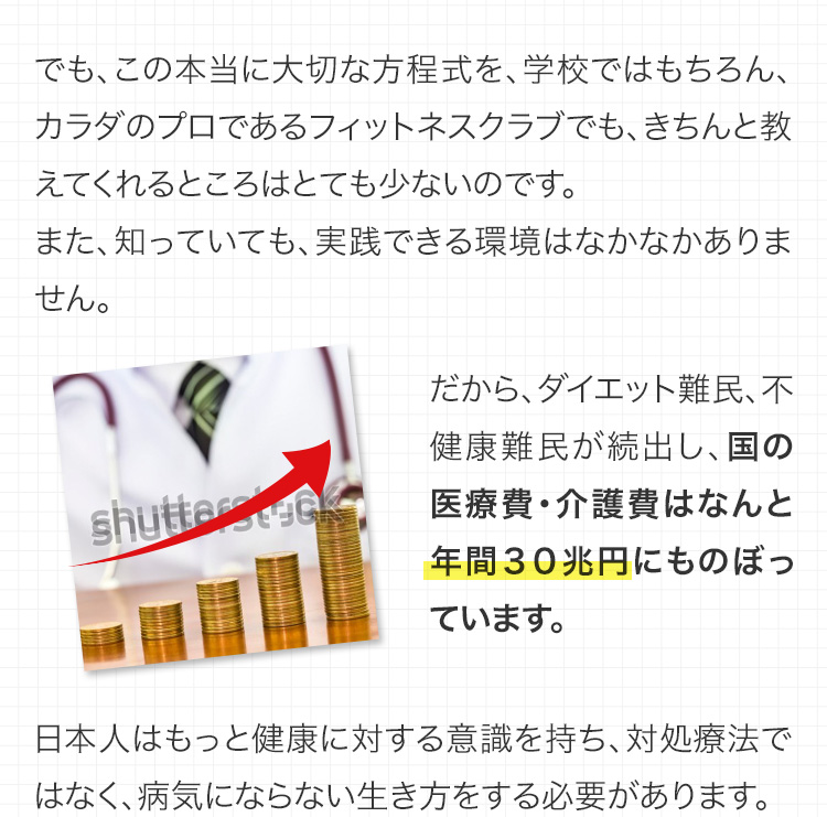 つまり、単に痩せるということだけではなく、将来的に病気や介護状態になり、ベッドの上でたくさんの医療費や介護費を払い続ける人生にならないために今のうちから対策が必要です。