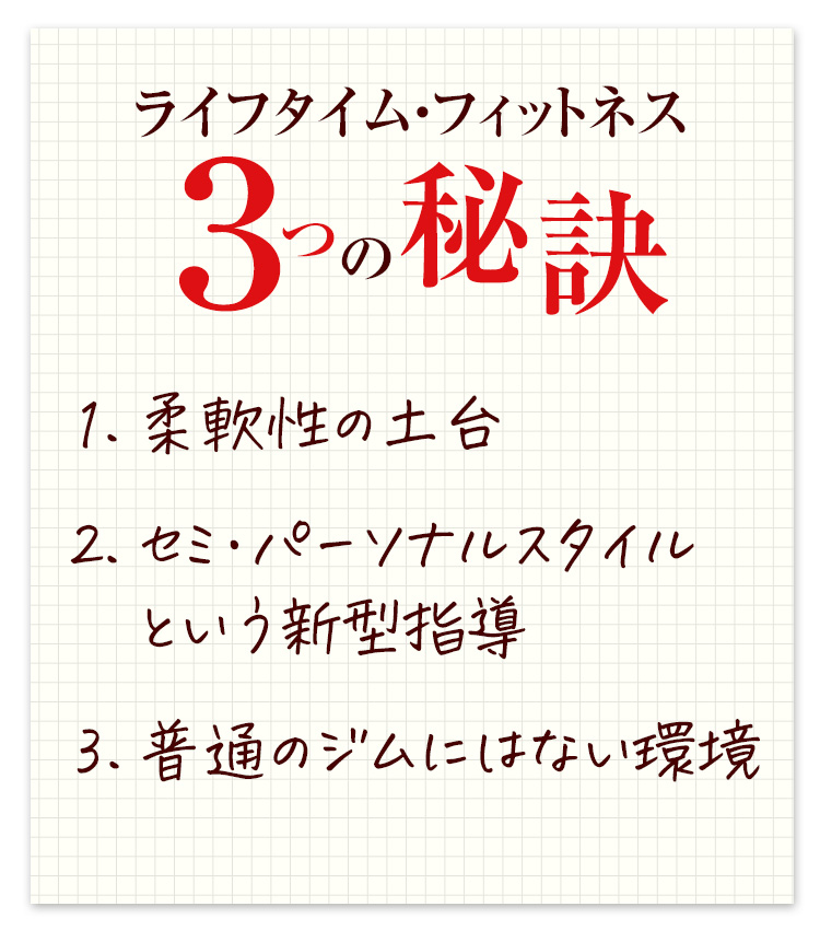 他のジムさんや自宅での運動だけでは決してできない、ライフタイム・フィットネスならではの秘訣は3つあります。