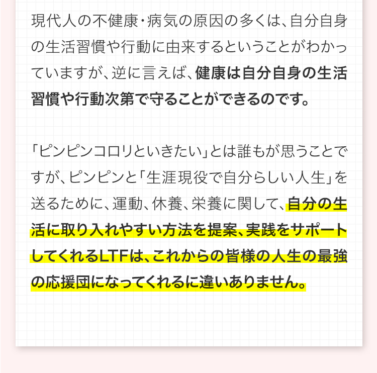 人生100年時代と言われますが、これからの時代の何よりの財産は「生涯の健康」です。