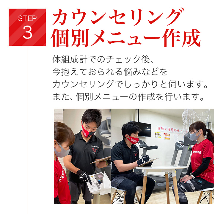 それにより、メンバーさんのニーズと現状を把握し、専用のトレーニングメニューを作成します。2回目からはメニューに沿ってトレーニングをしていただく流れになります。