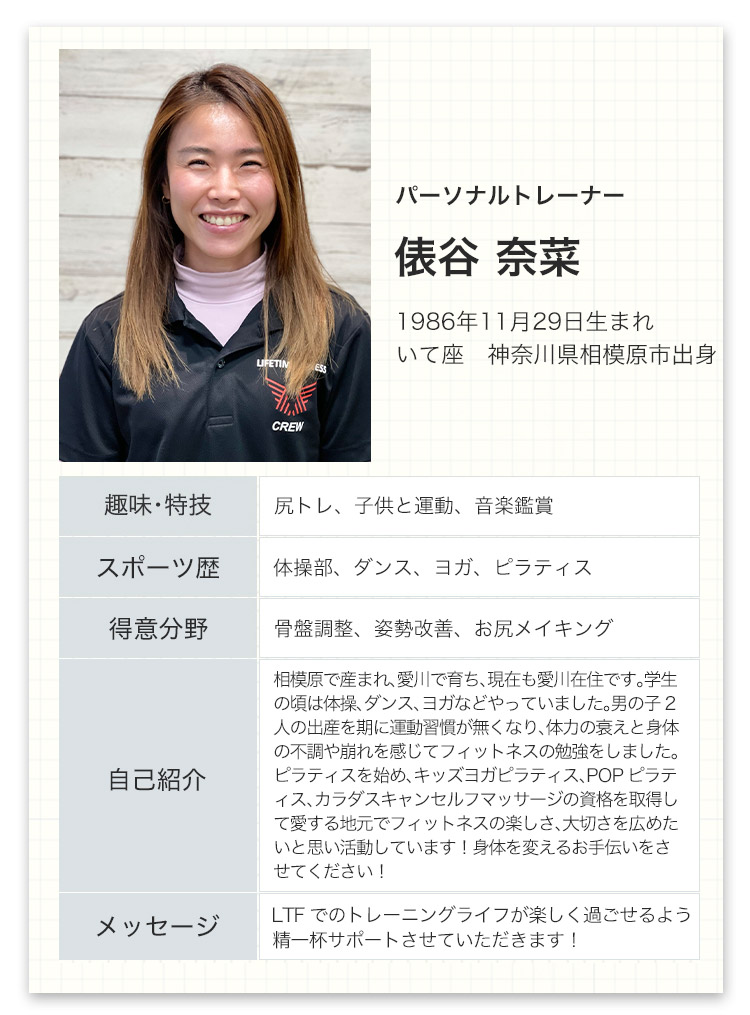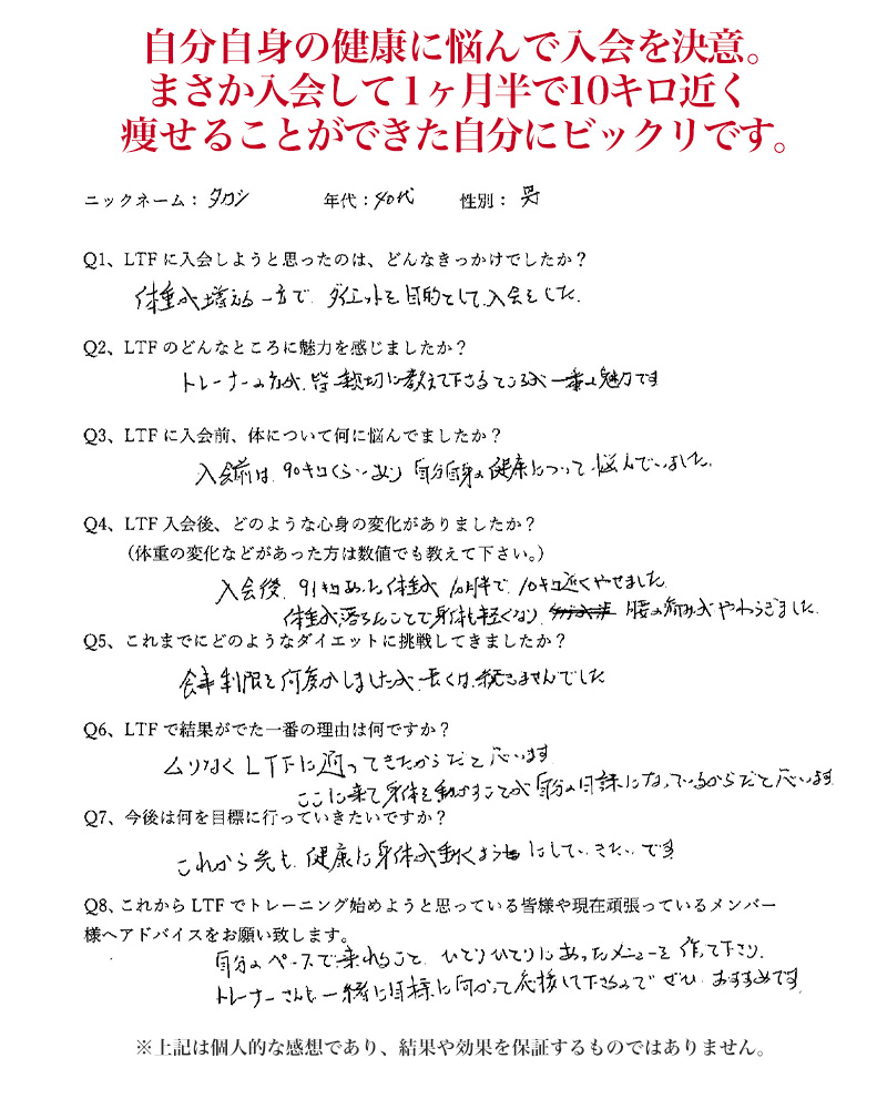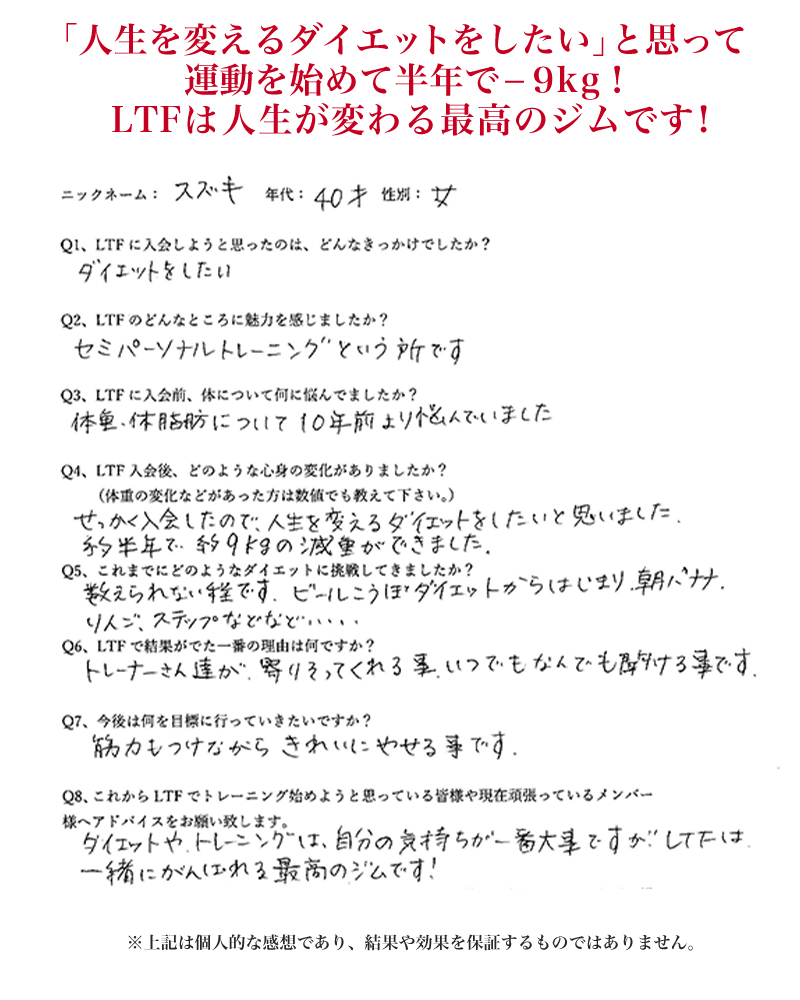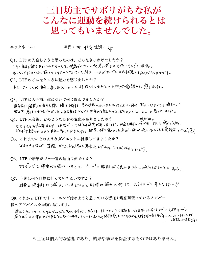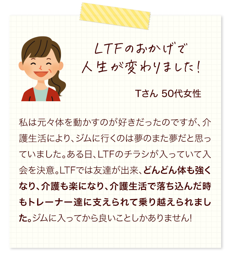 A:LTFはそんな方にこそお越しいただきたいジムです。トレーナーが丁寧に指導しますのでご安心ください。最初は誰もが初心者です。安心してLTFで一緒にフィットネスをスタートしましょう!