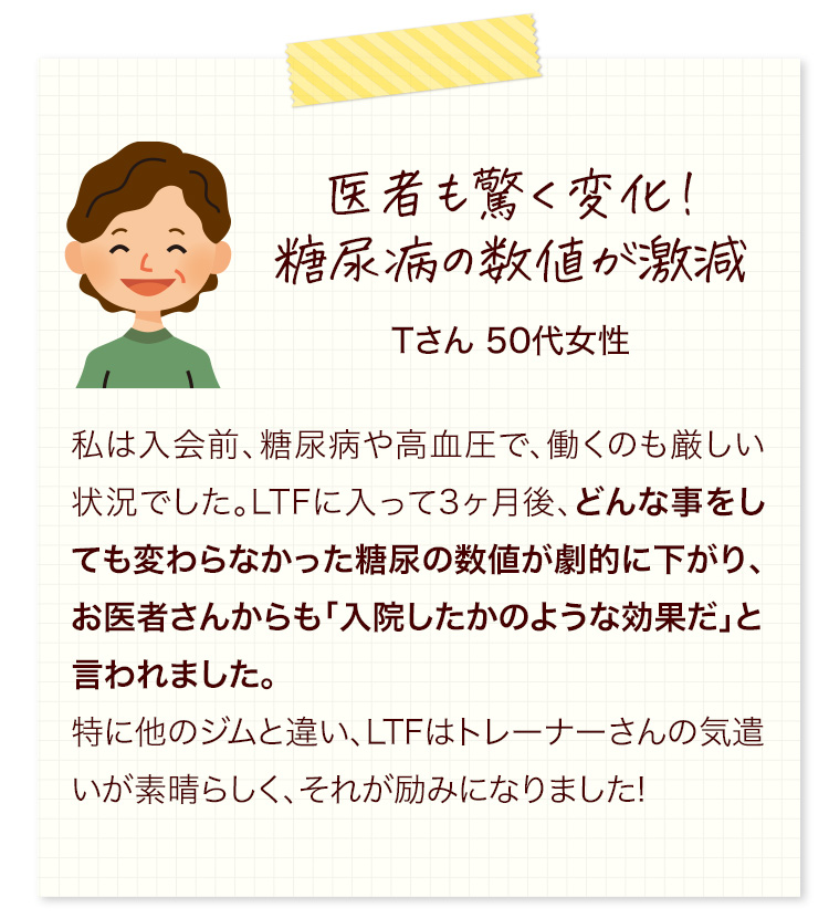 実は、ライフタイム・フィットネスには、お医者さんから「糖尿病手前です」と言われて一生病院通いになりかけた方も、通われて、数値が劇的に変わり、お医者さんも大変驚いたというような方が多数います。